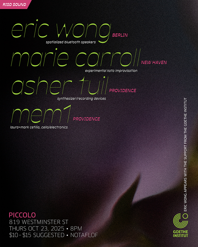 Excited to announce that my group Mem1 with Laura Cetilia will be performing at Piccolo in Providence on Thursday the 23rd as part of an evening presented by RISD Sound. The night will feature performances by Asher Tuil, Marie Carroll, and Eric Wong, who will also be giving a talk at RISD’s Studio for Research in Sound and Technology (SRST) on the 24th. More >>